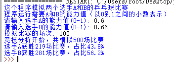b = eval(input("请输入选手B的能力值(0-1): "))