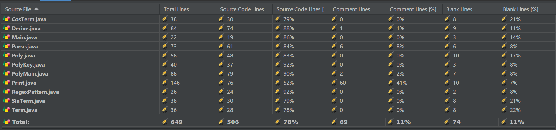 实现思路是首先使用正则表达式从头到尾匹配输入,判断输入是否正确。接着把输入按项分解,放进arraylist中。然后把arraylist里的项依次求导。求导后合并同类项。最后把化简输出。