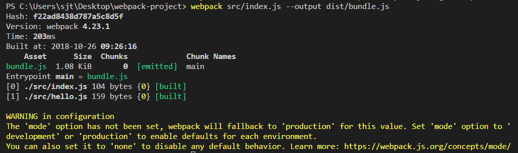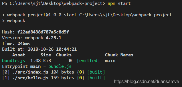 有了这个配置文件,我们只需在终端中运行webpack命令就可进行打包,这条命令会自动引用webpack.config.js文件中的配置选项,示例如下: