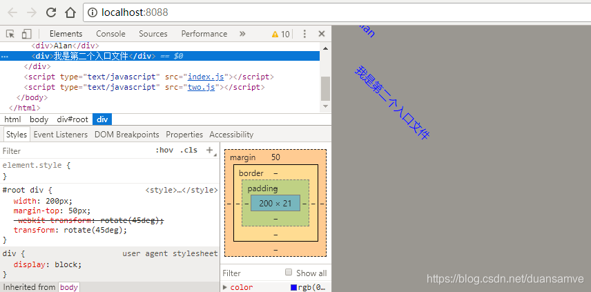 然后我们运行npm run build打包后发现/dist文件夹下会多出two.js文件,同时index.html也会自动将two.js引入,然后我们运行npm run dev显示如下: