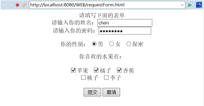 <!DOCTYPE html> <html> <head> <meta charset="UTF-8"> <title>request表单</title> </head> <body> <DIV ALIGN="center"> 请填写下面的表单<BR> <FORM ACTION="request.jsp"> 请输入你的姓名:<INPUT TYPE=text NAME="姓名"><BR> 请输入你的密码:<INPUT TYPE=password NAME="密码"> <P>你的性别: <INPUT TYPE=radio NAME="性别" VALUE="男">男 <INPUT TYPE=radio NAME="性别" VALUE="女">女 <INPUT TYPE=radio NAME="性别" VALUE="保密">保密 </P> <P>你喜欢的水果有:<BR><BR> <INPUT TYPE=checkbox NAME="水果" VALUE="苹果">苹果 <INPUT TYPE=checkbox NAME="水果" VALUE="橘子">橘子 <INPUT TYPE=checkbox NAME="水果" VALUE="香蕉">香蕉<BR> <INPUT TYPE=checkbox NAME="水果" VALUE="桃子">桃子 <INPUT TYPE=checkbox NAME="水果" VALUE="李子">李子 <BR><BR> <input TYPE=submit Name="enter" VALUE="提交"> <input TYPE=reset Name="rechoice" VALUE="重填"> </form> </DIV> </body> </html>