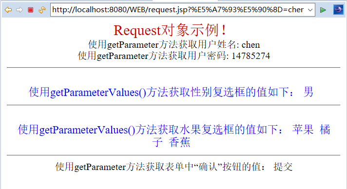 <%@ page language="java" contentType="text/html; charset=UTF-8" pageEncoding="UTF-8"%> <!DOCTYPE html PUBLIC "-//W3C//DTD HTML 4.01 Transitional//EN" "http://www.w3.org/TR/html4/loose.dtd"> <html> <head> <meta http-equiv="Content-Type" content="text/html; charset=ISO-8859-1"> <title>request对象</title> </head> <body> <CENTER> <FONT SIZE=5 COLOR="#CC0000"> Request对象示例!<BR> </FONT> 使用getParameter方法获取用户姓名: <% out.println(request.getParameter("姓名")); %> <BR>使用getParameter方法获取用户密码: <% out.println(request.getParameter("密码")); %> <FONT SIZE=4 COLOR="#0000FF"> <hr> <BR>使用getParameterValues()方法获取性别复选框的值如下: <% String Ncounter[]=request.getParameterValues("性别"); if(Ncounter!=null) { for(int i=0;i<Ncounter.length;i++) { out.print(Ncounter[i]+" "); } out.print("<HR>"); } %> <BR>使用getParameterValues()方法获取水果复选框的值如下: <% String Ncounter1[]=request.getParameterValues("水果"); if(Ncounter!=null) { for(int i1=0;i1<Ncounter1.length;i1++) { out.print(Ncounter1[i1]+" "); } out.print("<HR>"); } %> </FONT> 使用getParameter方法获取表单中“确认”按钮的值: <% out.println(request.getParameter("enter")); %> </CENTER> </body> </html>