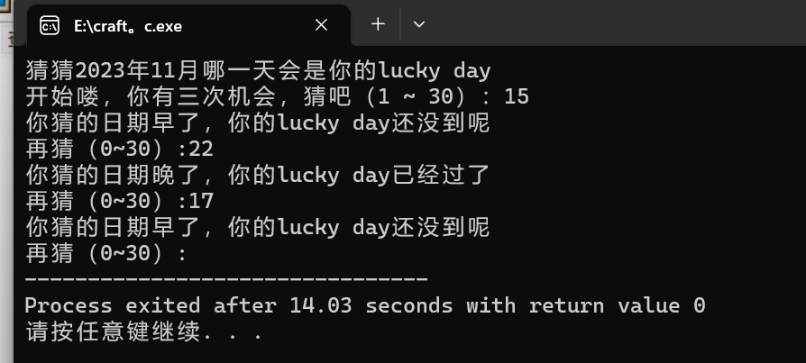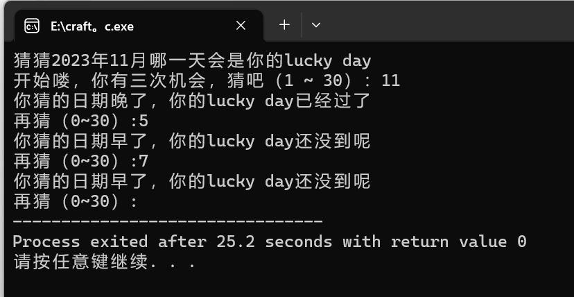 1 #include <stdio.h> 2 #include <time.h> 3 #include <stdlib.h> 4 int main(){ 5 int ld,i,d; 6 7 srand( time(0) ); 8 ld = rand()%31; 9 10 i = 3; 11 printf("猜猜2023年11月哪一天会是你的lucky day\n"); 12 printf("开始喽,你有三次机会,猜吧(1 ~ 30):"); 13 for(;i > 0;printf("再猜(0~30):"),i--){ 14 scanf("%d",&d); 15 if(d > ld) 16 printf("你猜的日期晚了,你的lucky day已经过了\n"); 17 else if(d < ld) 18 printf("你猜的日期早了,你的lucky day还没到呢\n"); 19 else if(d = ld) 20 printf("哇,猜中了:-)\n");return 0; 21 22 } 23 if(i = 0) 24 printf("悄悄告诉你,你的lucky day是%d",ld); 25 26 return 0; 27 }