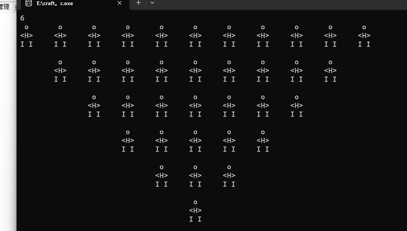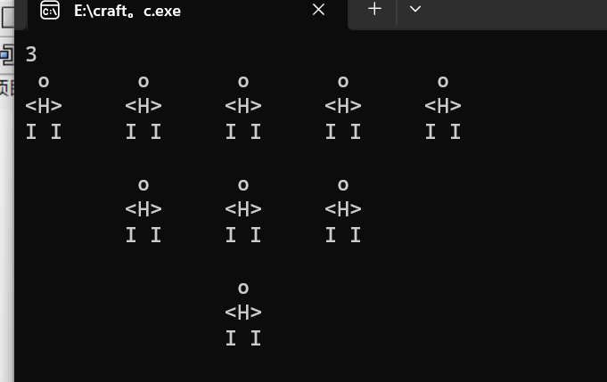 1 #include <stdio.h> 2 #include <time.h> 3 #include <stdlib.h> 4 int main(){ 5 int i, j,m,n,a,b,c,d; 6 char ch; 7 scanf("%d",&n); 8 ch = '\t'; 9 10 for(i = n;i > 0 ;i--){ 11 for(j = n - i; j > 0; j--){ 12 printf("%c",ch); 13 } 14 for(a =2*i - 1;a > 0;a--){ 15 printf(" o\t"); 16 } 17 printf("\n"); 18 for(m =n - i;m > 0; m--){ 19 printf("%c",ch); 20 } 21 for(b =2*i - 1;b > 0;b--){ 22 printf("<H>\t"); 23 } 24 printf("\n"); 25 for(c =n - i; c > 0; c--){ 26 printf("%c",ch); 27 } 28 for(d = 2*i - 1;d > 0;d--){ 29 printf("I I\t"); 30 } 31 printf("\n"); 32 printf("\n"); 33 } 34 return 0; 35 } 36 37