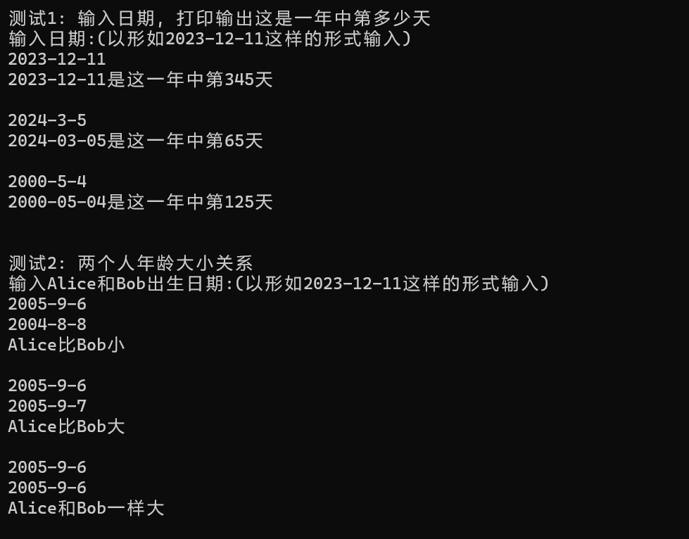 1 #include <stdio.h> 2 3 typedef struct { 4 int year; 5 int month; 6 int day; 7 } Date; 8 9 // 函数声明 10 void input(Date *pd); // 输入日期给pd指向的Date变量 11 int day_of_year(Date d); // 返回日期d是这一年的第多少天 12 int compare_dates(Date d1, Date d2); // 比较两个日期: 13 // 如果d1在d2之前,返回-1; 14 // 如果d1在d2之后,返回1 15 // 如果d1和d2相同,返回0 16 17 void test1() { 18 Date d; 19 int i; 20 21 printf("输入日期:(以形如2023-12-11这样的形式输入)\n"); 22 for(i = 0; i < 3; ++i) { 23 input(&d); 24 printf("%d-%02d-%02d是这一年中第%d天\n\n", d.year, d.month, d.day, day_of_year(d)); 25 } 26 } 27 28 void test2() { 29 Date Alice_birth, Bob_birth; 30 int i; 31 int ans; 32 33 printf("输入Alice和Bob出生日期:(以形如2023-12-11这样的形式输入)\n"); 34 for(i = 0; i < 3; ++i) { 35 input(&Alice_birth); 36 input(&Bob_birth); 37 ans = compare_dates(Alice_birth, Bob_birth); 38 39 if(ans == 0) 40 printf("Alice和Bob一样大\n\n"); 41 else if(ans == -1) 42 printf("Alice比Bob大\n\n"); 43 else 44 printf("Alice比Bob小\n\n"); 45 } 46 } 47 48 int main() { 49 printf("测试1: 输入日期, 打印输出这是一年中第多少天\n"); 50 test1(); 51 52 printf("\n测试2: 两个人年龄大小关系\n"); 53 test2(); 54 } 55 56 // 补足函数input实现 57 // 功能: 输入日期给pd指向的Date变量 58 void input(Date *pd) { 59 // 待补足 60 // ××x 61 scanf("%d-%d-%d",&pd->year ,&pd->month ,&pd->day ); 62 } 63 64 // 补足函数day_of_year实现 65 // 功能:返回日期d是这一年的第多少天 66 int day_of_year(Date d) { 67 // 待补足 68 // ××× 69 int k; 70 71 if(d.year % 4 == 0&&d.year % 100 != 0) 72 k = 1; 73 else if(d.year % 400 == 0) 74 k = 1; 75 else 76 k = 0; 77 78 if(k == 0) 79 { 80 switch(d.month ){ 81 case 1:return d.day ;break; 82 case 2:return 31 + d.day ;break; 83 case 3:return 59 + d.day ;break; 84 case 4:return 90 + d.day ;break; 85 case 5:return 120 + d.day ;break; 86 case 6:return 151 + d.day ;break; 87 case 7:return 181 + d.day ;break; 88 case 8:return 212 + d.day ;break; 89 case 9:return 243 + d.day ;break; 90 case 10:return 273 + d.day ;break; 91 case 11:return 304 + d.day ;break; 92 case 12:return 334 + d.day ;break; 93 } 94 } 95 else 96 { 97 switch(d.month ){ 98 case 1:return d.day ;break; 99 case 2:return 31 + d.day ;break; 100 case 3:return 59 + d.day +1;break; 101 case 4:return 90 + d.day +1;break; 102 case 5:return 120 + d.day +1;break; 103 case 6:return 151 + d.day +1;break; 104 case 7:return 181 + d.day +1;break; 105 case 8:return 212 + d.day +1;break; 106 case 9:return 243 + d.day +1;break; 107 case 10:return 273 + d.day +1;break; 108 case 11:return 304 + d.day +1;break; 109 case 12:return 334 + d.day +1;break; 110 } 111 112 } 113 } 114 // 补足函数compare_dates实现 115 // 功能:比较两个日期: 116 // 如果d1在d2之前,返回-1; 117 // 如果d1在d2之后,返回1 118 // 如果d1和d2相同,返回0 119 int compare_dates(Date d1, Date d2){ 120 int a,b; 121 a = day_of_year(d1); 122 b = day_of_year(d2); 123 if(a < b) 124 return -1; 125 else if(a > b) 126 return 1; 127 else 128 return 0; 129 } 130 // 待补足 131 // ×××