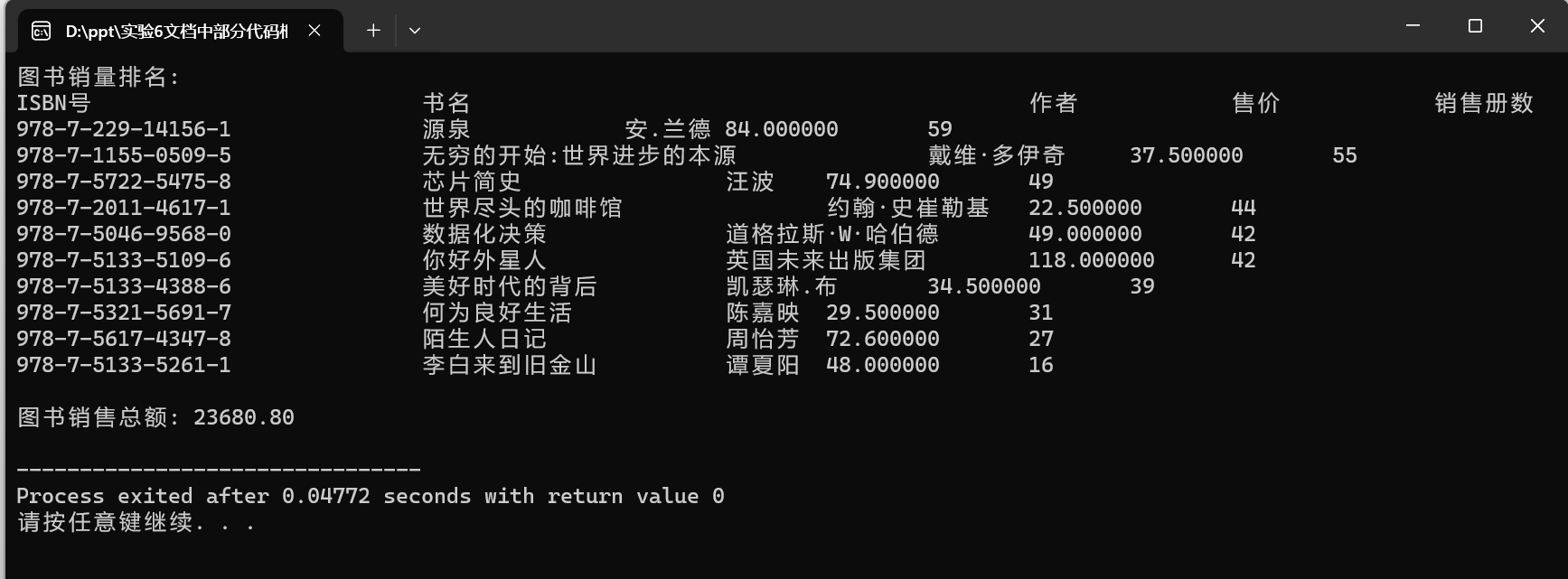 1 #include <stdio.h> 2 #define N 10 3 4 typedef struct { 5 char isbn[20]; // isbn号 6 char name[80]; // 书名 7 char author[80]; // 作者 8 double sales_price; // 售价 9 int sales_count; // 销售册数 10 } Book; 11 12 void output(Book x[], int n); 13 void sort(Book x[], int n); 14 double sales_amount(Book x[], int n); 15 16 int main() { 17 Book x[N] = {{"978-7-229-14156-1", "源泉", "安.兰德", 84, 59}, 18 {"978-7-5133-5261-1", "李白来到旧金山", "谭夏阳", 48, 16}, 19 {"978-7-5617-4347-8", "陌生人日记", "周怡芳", 72.6, 27}, 20 {"978-7-5722-5475-8", "芯片简史", "汪波", 74.9, 49}, 21 {"978-7-5046-9568-0", "数据化决策", "道格拉斯·W·哈伯德", 49, 42}, 22 {"978-7-5133-4388-6", "美好时代的背后", "凯瑟琳.布", 34.5, 39}, 23 {"978-7-1155-0509-5", "无穷的开始:世界进步的本源", "戴维·多伊奇", 37.5, 55}, 24 {"978-7-5321-5691-7", "何为良好生活", "陈嘉映", 29.5 , 31}, 25 {"978-7-5133-5109-6", "你好外星人", "英国未来出版集团", 118, 42}, 26 {"978-7-2011-4617-1", "世界尽头的咖啡馆", "约翰·史崔勒基", 22.5, 44}}; 27 28 printf("图书销量排名: \n"); 29 sort(x, N); 30 output(x, N); 31 32 printf("\n图书销售总额: %.2f\n", sales_amount(x, N)); 33 34 return 0; 35 } 36 37 // 待补足:函数output()实现 38 // ××× 39 void output(Book x[], int n) 40 { 41 int i; 42 printf("ISBN号 书名 作者 售价 销售册数\n"); 43 44 for(i = 0;i <= n-1;i++) 45 printf("%s\t\t%s\t\t%s\t%lf\t%d\n",x[i].isbn,x[i].name,x[i].author,x[i].sales_price,x[i].sales_count); 46 47 return ; 48 } 49 50 // 待补足:函数sort()实现 51 // ××× 52 void sort(Book x[], int n) 53 { 54 int i,j; 55 Book t; 56 for(i = 0;i <= n-1;i++) 57 for(j = 0;j <= n-1-i;j++) 58 if(x[j].sales_count < x[j+1].sales_count) 59 { 60 t = x[j]; 61 x[j] = x[j+1]; 62 x[j+1] = t; 63 } 64 65 return ; 66 } 67 68 // 待补足:函数sales_count()实现 69 // ××× 70 double sales_amount(Book x[], int n) 71 { 72 int i; 73 double s; 74 for(s = 0,i = 0;i <= n-1;i++) 75 { 76 s = s + x[i].sales_count*x[i].sales_price; 77 } 78 79 return s; 80 }