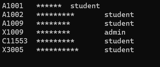 1 #include <stdio.h> 2 #include <string.h> 3 4 enum Role {admin, student, teacher}; 5 6 typedef struct { 7 char username[20]; // 用户名 8 char password[20]; // 密码 9 enum Role type; // 账户类型 10 } Account; 11 12 13 // 函数声明 14 void output(Account x[], int n); // 输出账户数组x中n个账户信息,其中,密码用*替代显示 15 16 int main() { 17 Account x[] = {{"A1001", "123456", student}, 18 {"A1002", "123abcdef", student}, 19 {"A1009", "xyz12121", student}, 20 {"X1009", "9213071x", admin}, 21 {"C11553", "129dfg32k", teacher}, 22 {"X3005", "921kfmg917", student}}; 23 int n; 24 n = sizeof(x)/sizeof(Account); 25 output(x, n); 26 27 return 0; 28 } 29 30 // 待补足的函数output()实现 31 // 功能:遍历输出账户数组x中n个账户信息 32 // 显示时,密码字段以与原密码相同字段长度的*替代显示 33 void output(Account x[], int n) { 34 // 待补足 35 // ××× 36 int i,j; 37 38 for(i = 0;i <= n-1;i++) 39 { 40 printf("%s\t",x[i].username); 41 42 for(j = 1;j <= strlen(x[i].password);j++) 43 printf("*"); 44 45 printf("\t"); 46 47 switch(x[i].type) 48 { 49 case(0):printf("admin");break; 50 case(1):printf("student");break; 51 case(2):printf("student");break; 52 } 53 printf("\n"); 54 } 55 }