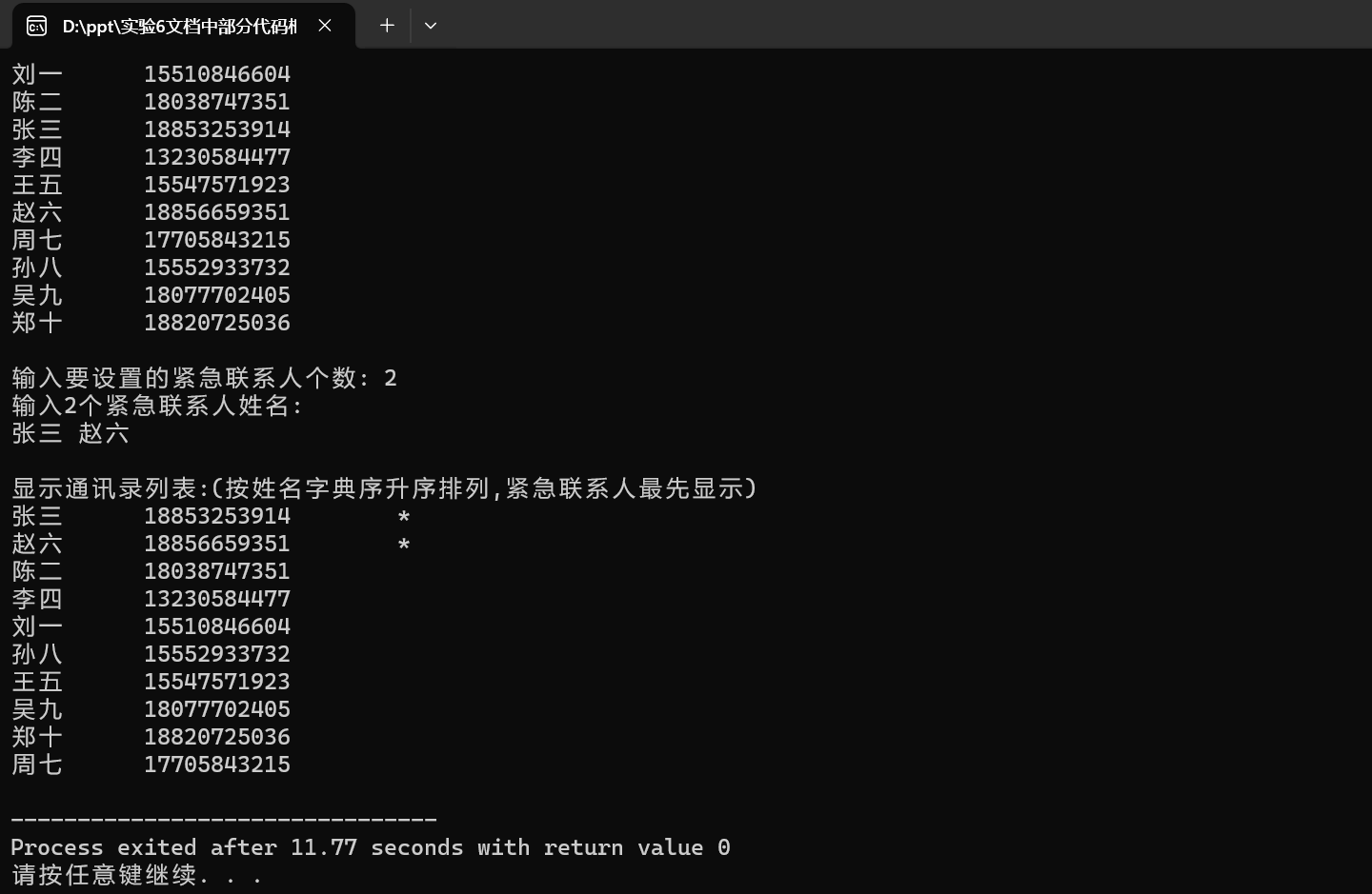 1 #include <stdio.h> 2 #include <string.h> 3 4 typedef struct { 5 char name[20]; // 姓名 6 char phone[12]; // 手机号 7 int vip; // 是否为紧急联系人,是取1;否则取0 8 } Contact; 9 10 11 // 函数声明 12 void set_vip_contact(Contact x[], int n, char name[]); // 设置紧急联系人 13 void output(Contact x[], int n); // 输出x中联系人信息 14 void display(Contact x[], int n); // 按联系人姓名字典序升序显示信息,紧急联系人最先显示 15 void rank(Contact x[],int n); 16 17 #define N 10 18 int main() { 19 Contact list[N] = {{"刘一", "15510846604", 0}, 20 {"陈二", "18038747351", 0}, 21 {"张三", "18853253914", 0}, 22 {"李四", "13230584477", 0}, 23 {"王五", "15547571923", 0}, 24 {"赵六", "18856659351", 0}, 25 {"周七", "17705843215", 0}, 26 {"孙八", "15552933732", 0}, 27 {"吴九", "18077702405", 0}, 28 {"郑十", "18820725036", 0}}; 29 int vip_cnt, i; 30 char name[20]; 31 32 printf("显示原始通讯录信息: \n"); 33 output(list, N); 34 35 printf("\n输入要设置的紧急联系人个数: "); 36 scanf("%d", &vip_cnt); 37 printf("输入%d个紧急联系人姓名:\n", vip_cnt); 38 for(i = 0; i < vip_cnt; ++i) { 39 scanf("%s", name); 40 set_vip_contact(list, N, name); 41 } 42 43 printf("\n显示通讯录列表:(按姓名字典序升序排列,紧急联系人最先显示)\n"); 44 display(list, N); 45 46 return 0; 47 } 48 49 // 补足函数set_vip_contact实现 50 // 功能:将联系人数组x中,联系人姓名与name一样的人,设置为紧急联系人(即成员vip值设为1) 51 void set_vip_contact(Contact x[], int n, char name[]) { 52 // 待补足 53 // ××× 54 int i; 55 56 for(i = 0;i < n;i++) 57 { 58 if(strcmp(x[i].name,name) == 0) 59 x[i].vip = 1; 60 } 61 62 } 63 64 // 补足函数display实现 65 // 功能: 显示联系人数组x中的联系人信息 66 // 按姓名字典序升序显示, 紧急联系人显示在最前面 67 void display(Contact x[], int n) { 68 // 待补足 69 // ××x 70 int i, j, k = 0; 71 Contact u; 72 73 rank(x,n); 74 75 76 for(i = 0;i < n;i++) 77 { 78 if(x[i]. vip == 1) 79 { 80 for(j = i;j > 0;j--) 81 { 82 u = x[j]; 83 x[j] = x[j-1]; 84 x[j-1] =u; 85 } 86 k++; 87 } 88 } 89 90 rank(x,k); 91 92 output(x,n); 93 94 } 95 96 void output(Contact x[], int n) { 97 int i; 98 99 for(i = 0; i < n; ++i) { 100 printf("%-10s%-15s", x[i].name, x[i].phone); 101 if(x[i].vip) 102 printf("%5s", "*"); 103 printf("\n"); 104 } 105 } 106 107 void rank(Contact x[],int n) 108 { 109 int i, j; 110 Contact u; 111 112 for(i = 0;i < n - 1;i++) 113 for(j = 0;j < n - i -1;j++) 114 if(strcmp(x[j].name,x[j+1].name) > 0){ 115 u = x[j+1]; 116 x[j+1] = x[j]; 117 x[j] = u; 118 } 119 120 }