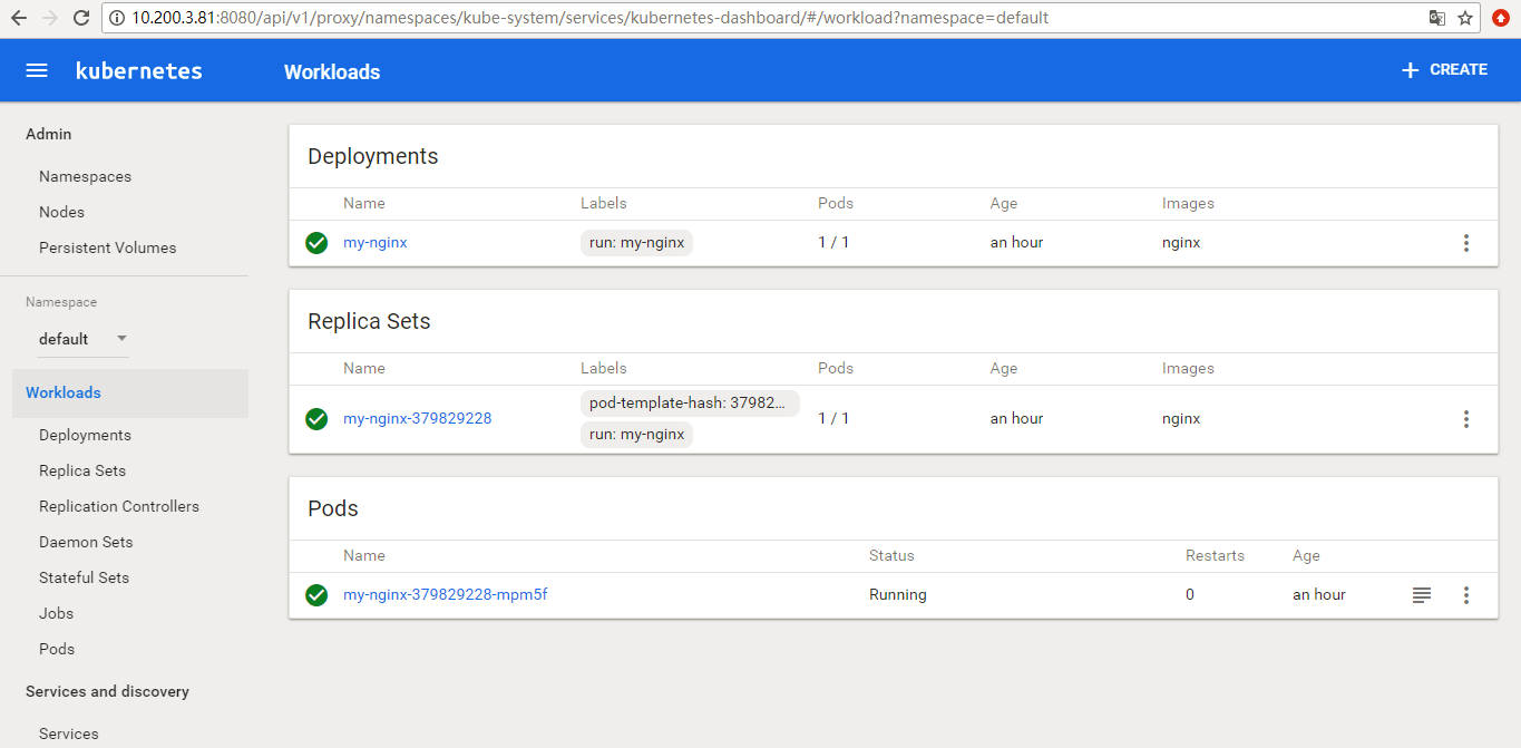 [root@localhost ~]# kubectl get pods --all-namespaces NAMESPACE NAME READY STATUS RESTARTS AGE default my-nginx-379829228-mpm5f 1/1 Running 0 59m kube-system kubernetes-dashboard-3162153223-2s0qb 1/1 Running 0 40m