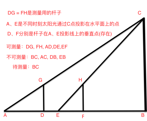 先说明测量的可行性,杆子可以这样摆放,因为垂直线在AB上从0增大到BC,也已知杆子的长度远小于山峰的高度, 即DB << BC,同样对于FH有同样的结论,因此测量是可行的