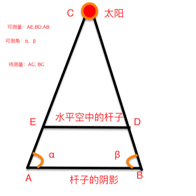 先说明可测性,可以想象太阳如地球公转的圆心,通过再架AE、BD两根杆子可测得夹角α和β