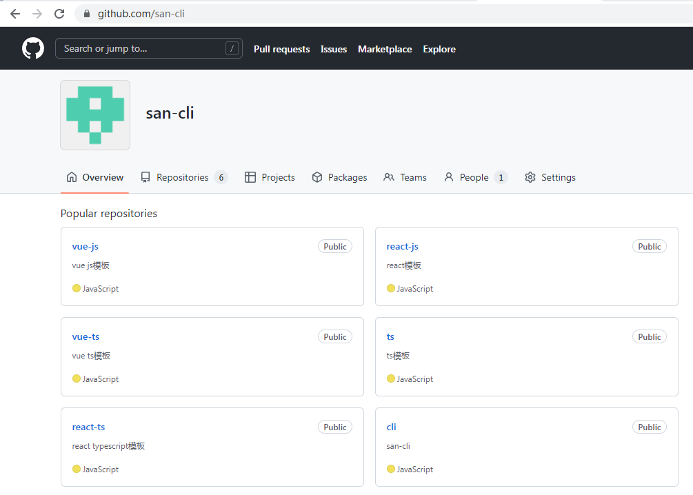 由于我提供了交互,我将根据交互结果为用户提供指定的模板。为了更好的管理模板,建议创建一个组织。下面san-cli就是我的组织,在组织里面可以创建很多仓库。