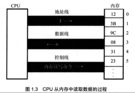 2)CPU通过控制线发出内存读命令,选中存储器芯片,并通知它,将要从中读数据