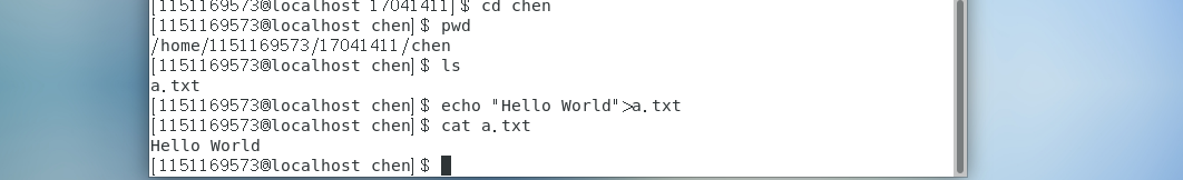 (5)进入当前目录的第一个子目录,然后显示当前目录,并列出当前目录的内容,并向文件a.txt写入一个字符串Hello World
