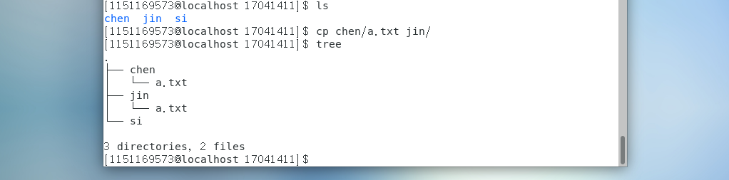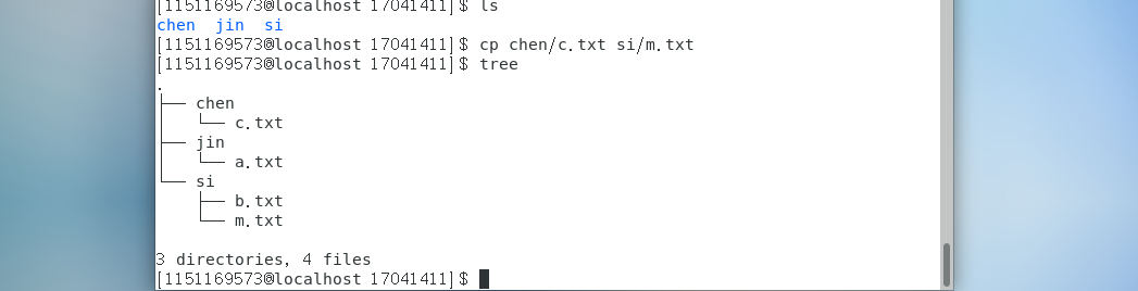 (7)把当前目录的第一个子目录中文件a.txt复制到第二个子目录中,然后再次把第一个子目录中的a.txt复制到第三个子目录并命名为b.txt,最后把第一个子目录中文件a.txt重命名为c.txt。通过tree命令查看当前目录情况。