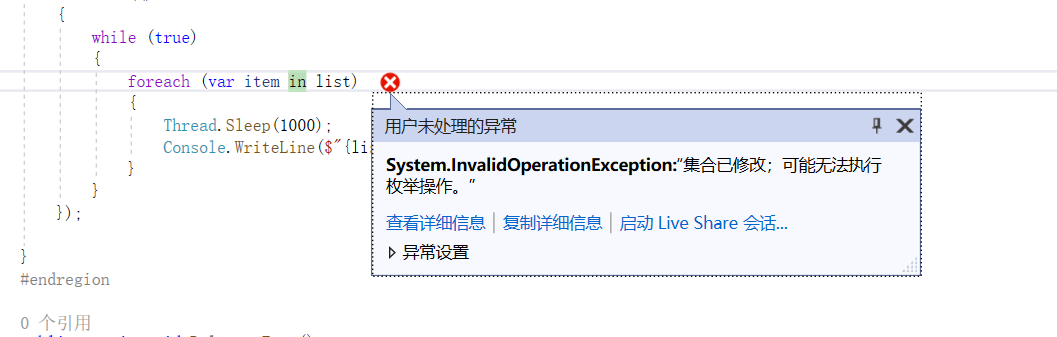 namespace TestConsole { class Program { private static List<int> list = new List<int>();//非线程安全,“集合已修改;可能无法执行枚举操作。” //private static ConcurrentBag<int> list = new ConcurrentBag<int>(); static void Main(string[] args) { try { ThreadSafetyTest(); Console.ReadKey(); } catch (Exception ex) { MessageBox.Show(ex.StackTrace + " " + ex.Message); } } } }