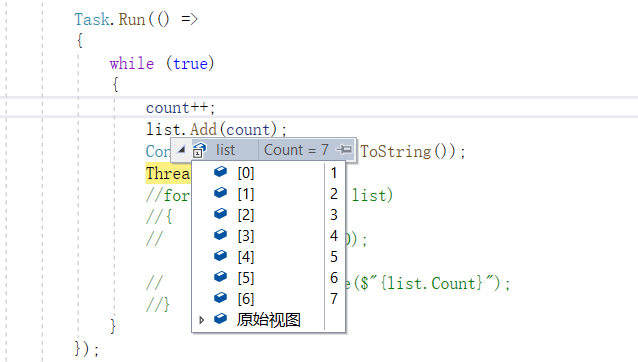 定义一个函数--- ThreadSafetyTest();新建一个name为 t 的Task,后台以一秒为周期往list里面添加count++的值;再新建一个Task将list的值输出;