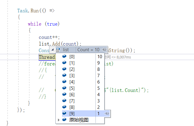 #region 线程安全之ConcurrentBag 验证 private static void ThreadSafetyTest() { int count = 0; Task t = new Task(() => { while (true) { Thread.Sleep(1000); count++; list.Add(count); } }); t.Start(); Task.Run(() => { while (true) { foreach (var item in list) { Thread.Sleep(1000); Console.WriteLine($"{list.Count}"); } } }); } #endregion