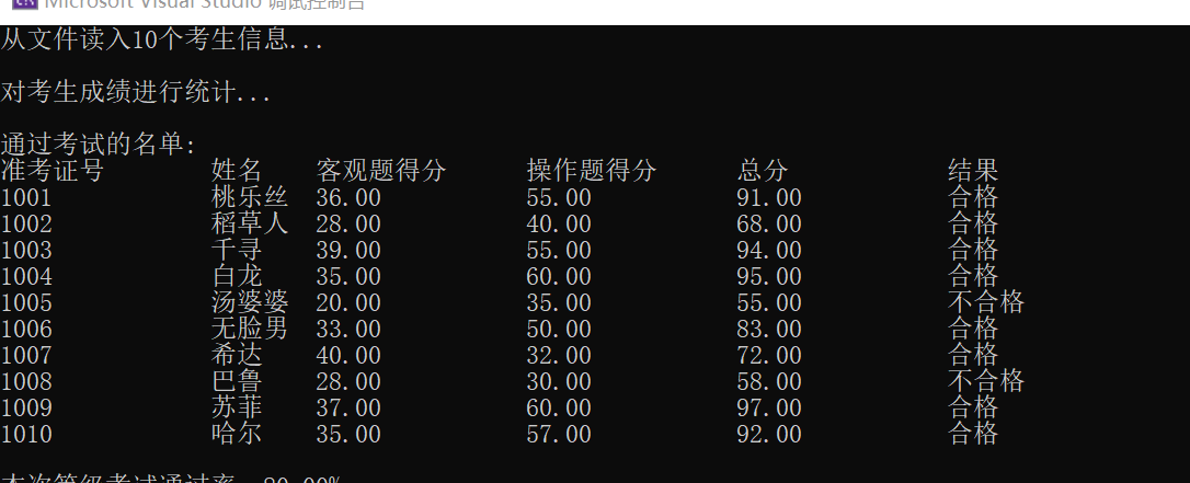 1 #define _CRT_SECURE_NO_WARNINGS 2 #include <stdio.h> 3 #include <string.h> 4 #include <stdlib.h> 5 6 #define N 10 7 8 typedef struct { 9 long int id; 10 char name[20]; 11 float objective; // 客观题得分 12 float subjective; // 操作题得分 13 float sum; // 总分 14 char ans[10]; // 考试结果 15 } STU; 16 17 // 函数声明 18 void finput(STU st[], int n); 19 void foutput(STU st[], int n); 20 void output(STU st[], int n); 21 int process(STU st[], int n, STU st_pass[]); 22 23 int main() { 24 STU stu[N], stu_pass[N]; 25 int cnt; 26 double pass_rate; 27 28 printf("从文件读入%d个考生信息...\n", N); 29 finput(stu, N); 30 31 printf("\n对考生成绩进行统计...\n"); 32 cnt = process(stu, N, stu_pass); 33 34 printf("\n通过考试的名单:\n"); 35 output(stu, N); // 输出到屏幕 36 foutput(stu, N); // 输出到文件 37 38 pass_rate = 1.0 * cnt / N; 39 printf("\n本次等级考试通过率: %.2f%%\n", pass_rate*100); 40 41 return 0; 42 } 43 44 // 把通过考试的考生完整信息输出到屏幕上 45 // 准考证号,姓名,客观题得分,操作题得分,总分,结果 46 void output(STU st[], int n) { 47 int i; 48 49 printf("准考证号\t姓名\t客观题得分\t操作题得分\t总分\t\t结果\n"); 50 for (i = 0; i < n; i++) 51 printf("%ld\t\t%s\t%.2f\t\t%.2f\t\t%.2f\t\t%s\n", st[i].id, st[i].name, st[i].objective, st[i].subjective, st[i].sum, st[i].ans); 52 } 53 54 // 从文本文件examinee.txt读入考生信息:准考证号,姓名,客观题得分,操作题得分 55 void finput(STU st[], int n) { 56 int i; 57 FILE *fin; 58 59 fin = fopen("c:\\data\\examinee.txt", "r"); 60 if (fin == NULL) { 61 printf("fail to open file\n"); 62 exit(0); 63 } 64 65 while (!feof(fin)) { 66 for (i = 0; i < n; i++) 67 fscanf(fin, "%ld %s %f %f", &st[i].id, st[i].name, &st[i].objective, &st[i].subjective); 68 } 69 70 fclose(fin); 71 } 72 73 // 把通过考试的考生完整信息写入文件list_pass.txt 74 // 准考证号,姓名,客观题得分,操作题得分,总分,结果 75 void foutput(STU s[], int n) { 76 FILE *fout; 77 int i; 78 79 // 保存到文件 80 fout = fopen("list_pass.txt", "w"); 81 if (!fout) { 82 printf("fail to open or create list_pass.txt\n"); 83 exit(0); 84 } 85 86 fprintf(fout, "准考证号\t\t姓名\t客观题得分\t操作题得分\t总分\t\t结果\n"); 87 88 for (i = 0; i < n; i++) 89 fprintf(fout, "%ld\t\t%s\t%.2f\t\t%.2f\t\t%.2f\t\t%s\n", s[i].id, s[i].name, s[i].objective, s[i].subjective, s[i].sum, s[i].ans); 90 91 fclose(fout); 92 } 93 94 95 96 // 对考生信息进行处理:计算每位考生考试总分、结果;统计考试通过的人数 97 int process(STU st[], int n, STU st_pass[]) { 98 int i; 99 int j = 0; 100 for (i = 0; i < n; i++) 101 { 102 st[i].sum = st[i].objective + st[i].subjective; 103 } 104 for (i = 0; i < n; i++) 105 { 106 if (st[i].sum >= 60) 107 { 108 st_pass[j++] = st[i]; 109 strcpy(st[i].ans, "合格"); 110 } 111 else 112 { 113 strcpy(st[i].ans, "不合格"); 114 } 115 } 116 return j; 117 }