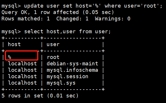 update user set host='%' where user='root'; #%通配符,表示IP,网段