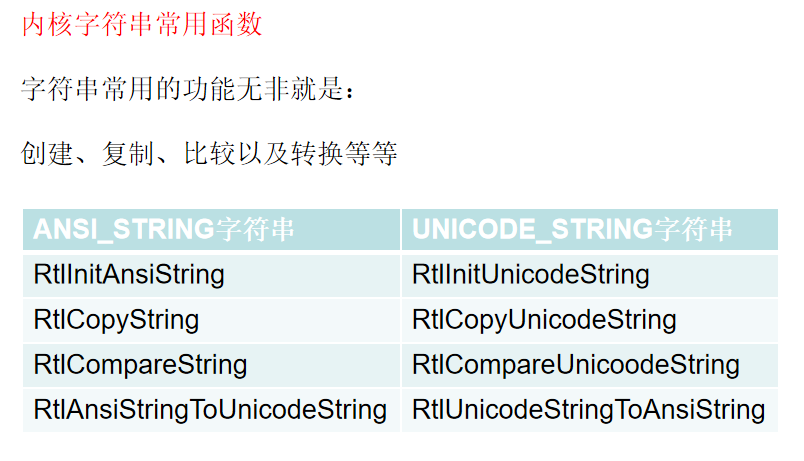 //CHAR(char)/WCHAR(wchar_t)/ANSI_STRING/UNICODE_STRING //ANSI_STRING字符串: typedef struct _STRING { USHORT Length; USHORT MaximumLength; PCHAR Buffer; }STRING; //UNICODE_STRING字符串: typedef struct _UNICODE_STRING { USHORT Length; USHORT MaxmumLength; PWSTR Buffer; } UNICODE_STRING;