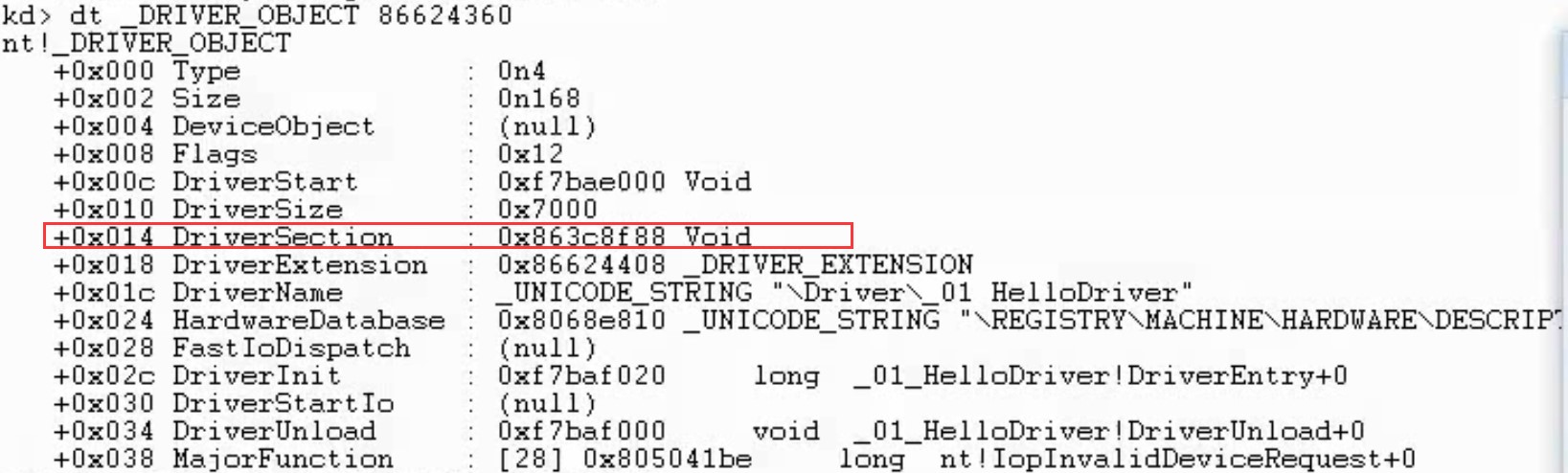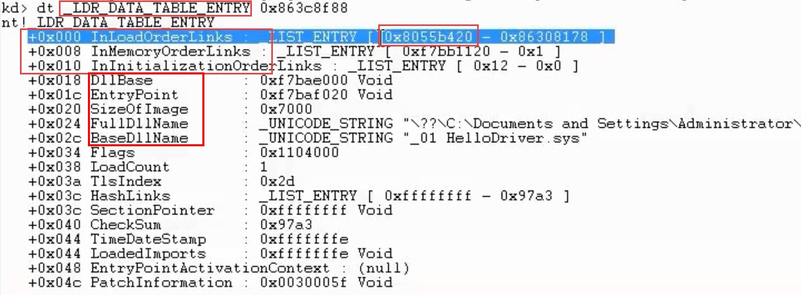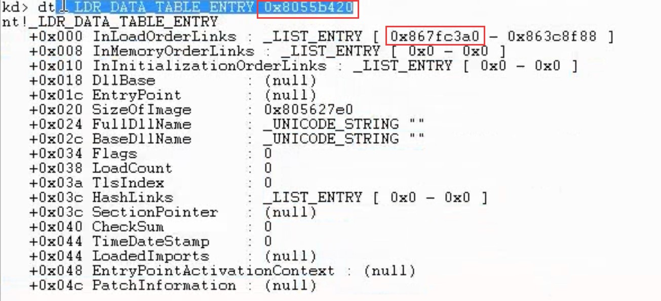 通过内核对象地址,找到DriverSection,这是一个指针,指向_LDR_DATA_TABLE_ENTRY,第一个成员就是自己的内核对象