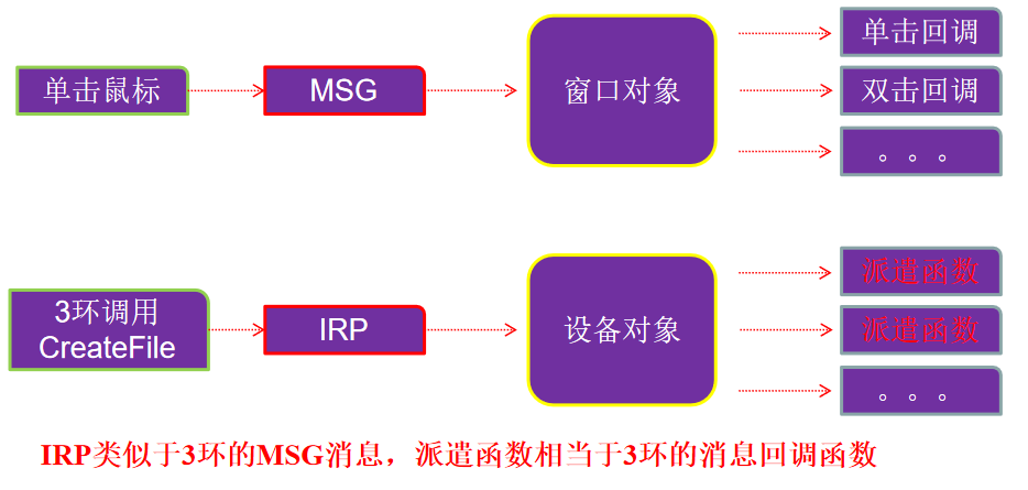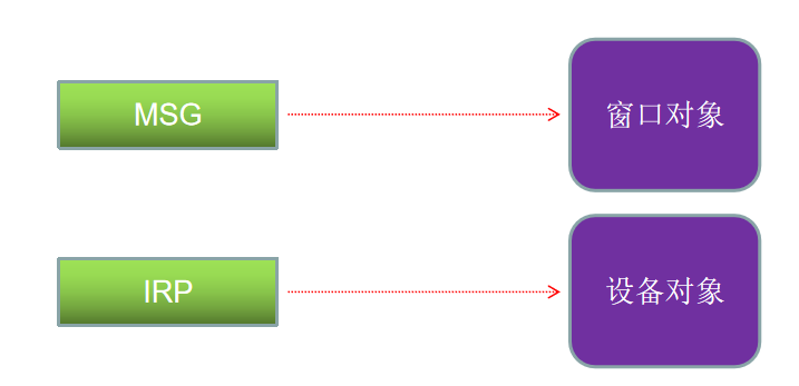 - 在开发窗口程序的时候,消息被封装成一个结构体:MSG,在内核开发时,消息被封装成另外一个结构体:IRP(I/O Request Package)。