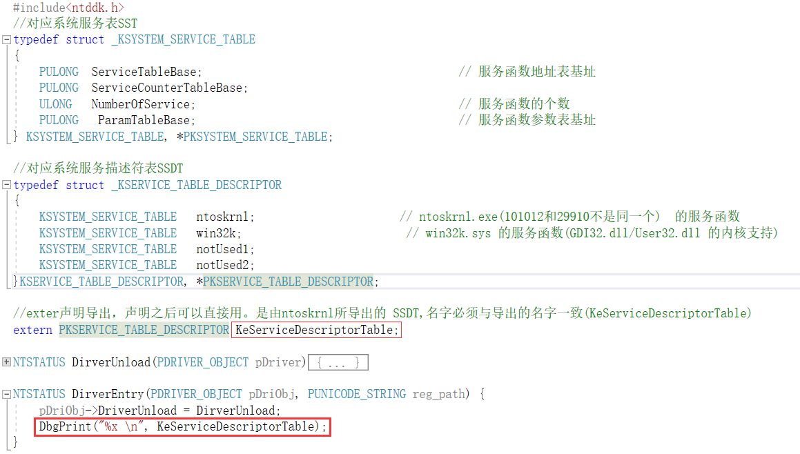 - 测试导出全局变量KeServiceDescriptorTable,获取SSDT表