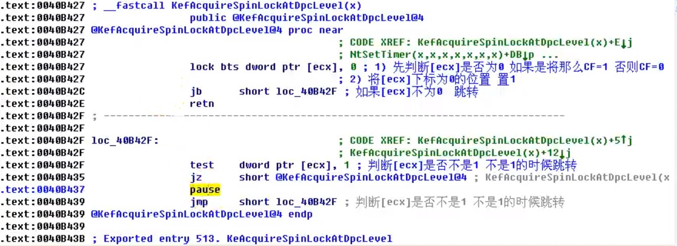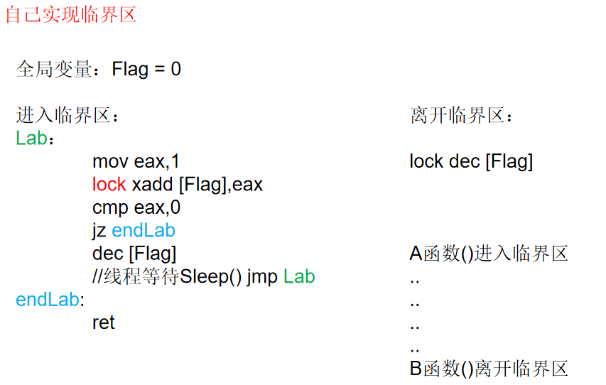 - 首先判断[ecx]是否为0,为0说明当前没有线程进去临界区,可以进入,进入临界区时,将[ecx]设置为1