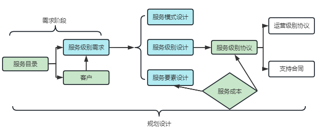 规划设计从服务需求出发,终点为设计出符合业务需求和成果的服务方案:①需求阶段,客户结合服务目录的定义和自身要求,提出服务级别需求→②服务供方根据服务需求,进行服务模式设计、服务级别设计、服务要素设计等关键活动,同时兼顾成本控制和定价→③最终形成服务级别协议(Scrvice Level Agreement,SLA)、运营级别协议(Operational Level Agreement,OLA)和支持合同(Underpimjng Contract,UC)