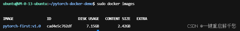 执行 docker images 命令查看本地镜像列表,若能找到 pytorch-first 镜像,说明构建成功: