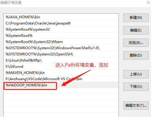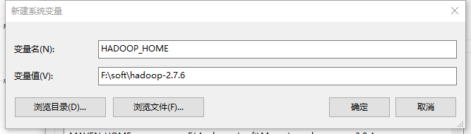 hadoop-2.7.6的路径,例F:\soft\hadoop-2.7.6 -