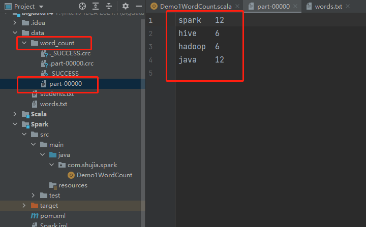 //会在data目录中,生成一个子目录word_count,运行结果在part-00000中