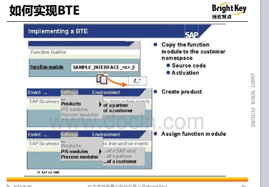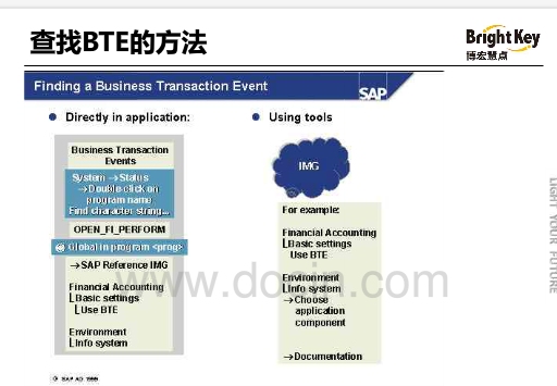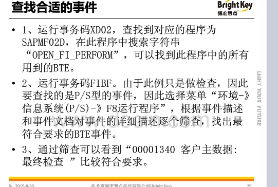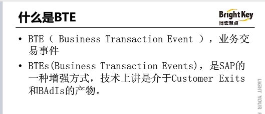 BTE全称Business Transaction Event,是由SAP在标准程序中预设的一些事件(或称为锚点),用户可以为该事件指定各自的实现逻辑。