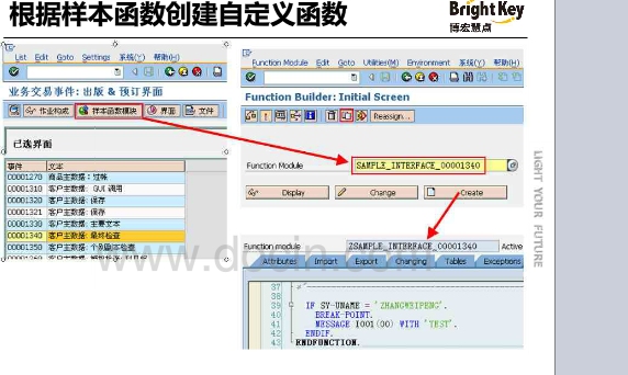 Sample function module。如:’SAMPLE_INTERFACE_00001120’或者’SAMPLE_PROCESS_00001120’,拷贝为自定义的函数。如: ZINTERFACE_00001120或者ZPROCESS_00001120’。