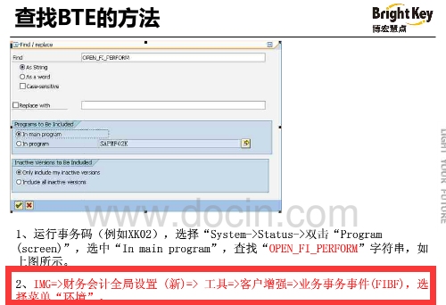 1.查找BTE增强,在标准程序中查找String ‘OPEN_FI_PERFORM’,找到的函数如果最后是’_E’,则说明这是Publishand Subscribe Interface:,如果是’_P’,则是ProcessInterface。