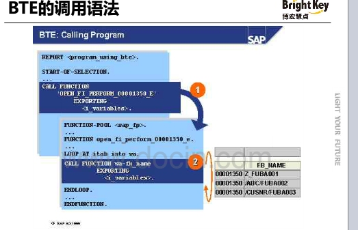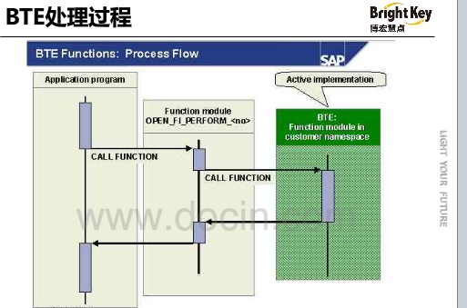 BTE的设计思路还是比较简单,和BADI有点类似。在标准程序中留有OPEN_FI的出口(以函数OPEN_FI_PERFORM_eventid_type的形式存在),然后提供一个可配置的TABLE,可以在里面针对某个特定的Event维护自己定义的出口函数,标准程序走到这里,如果查出用户定义了出口函数,则会调用,达到增强的目的。