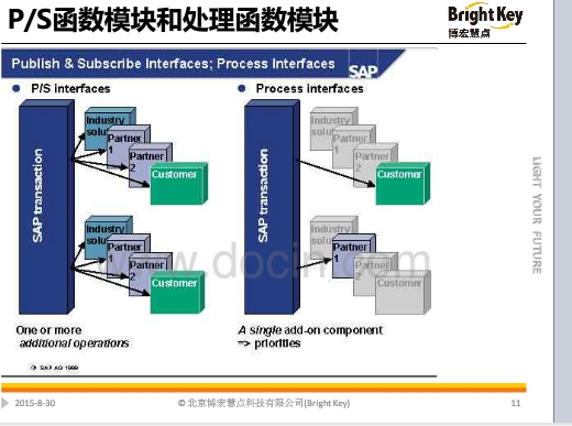 至于Publish and Subscribe Interface和Process Interface的区别,主要还是用途上的。前者,使给外部软 件提供信息的,而后者主要用于R/3流程的。不过前者也可以生成或修改一些additional data。
