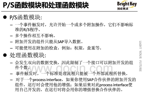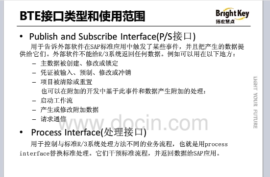 BTE包含发布&订阅接口和处理接口,发布&订阅接口(Publish and Subscribe Interface)用于告诉外部程序在标准程序中触发了哪些事件,并且把相关的数据提供给外部,外部程序不能返回任何数据给SAP,处理接口(Process Interface)会将外部程序处理后的数据返回给标准程序,可能对标准程序中后续的处理逻辑产生影响。