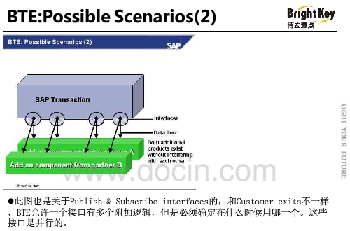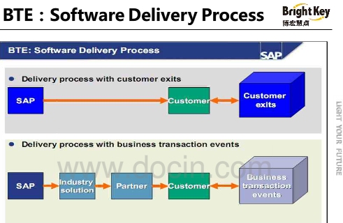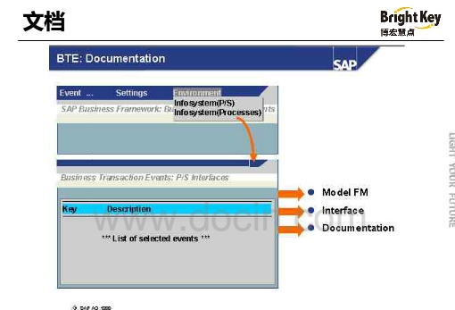 BTE分为三种级别,内部事件、合作伙伴的事件和客户的事件,内部事件由SAP发布,合作伙伴事件由SAP软件开发伙伴提供,客户事件由实施顾问配置开发用于实现企业内部的特殊需求。