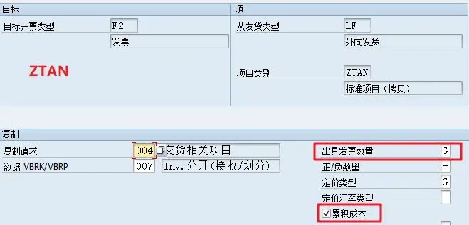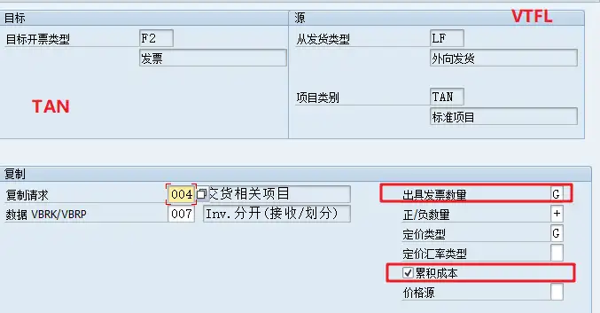 - VTFL 开票类型F2外向发货LF,TAN/ZTAN项目出具发票数量为G, 勾选累积成本