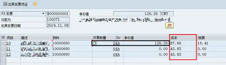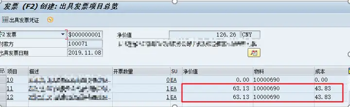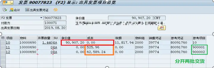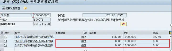 发货时,对同一个物料指定了不同批次的数量(比如物料A0001,批次P0001发货10个,批次P0002发货20个),开票时看到的效果是这样的: