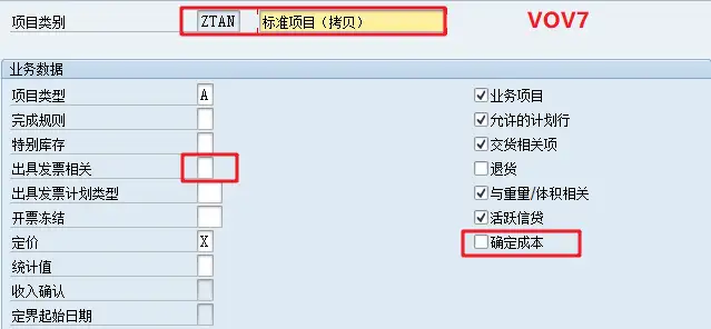 - VOV7设置项目类别TAN(表示销售订单标准行项目类别)字段 “出具发票相关设置”为“A”,勾选“确定成本”