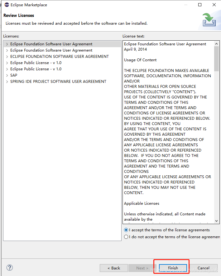 5、I accept the terms of the license agreements->Finish