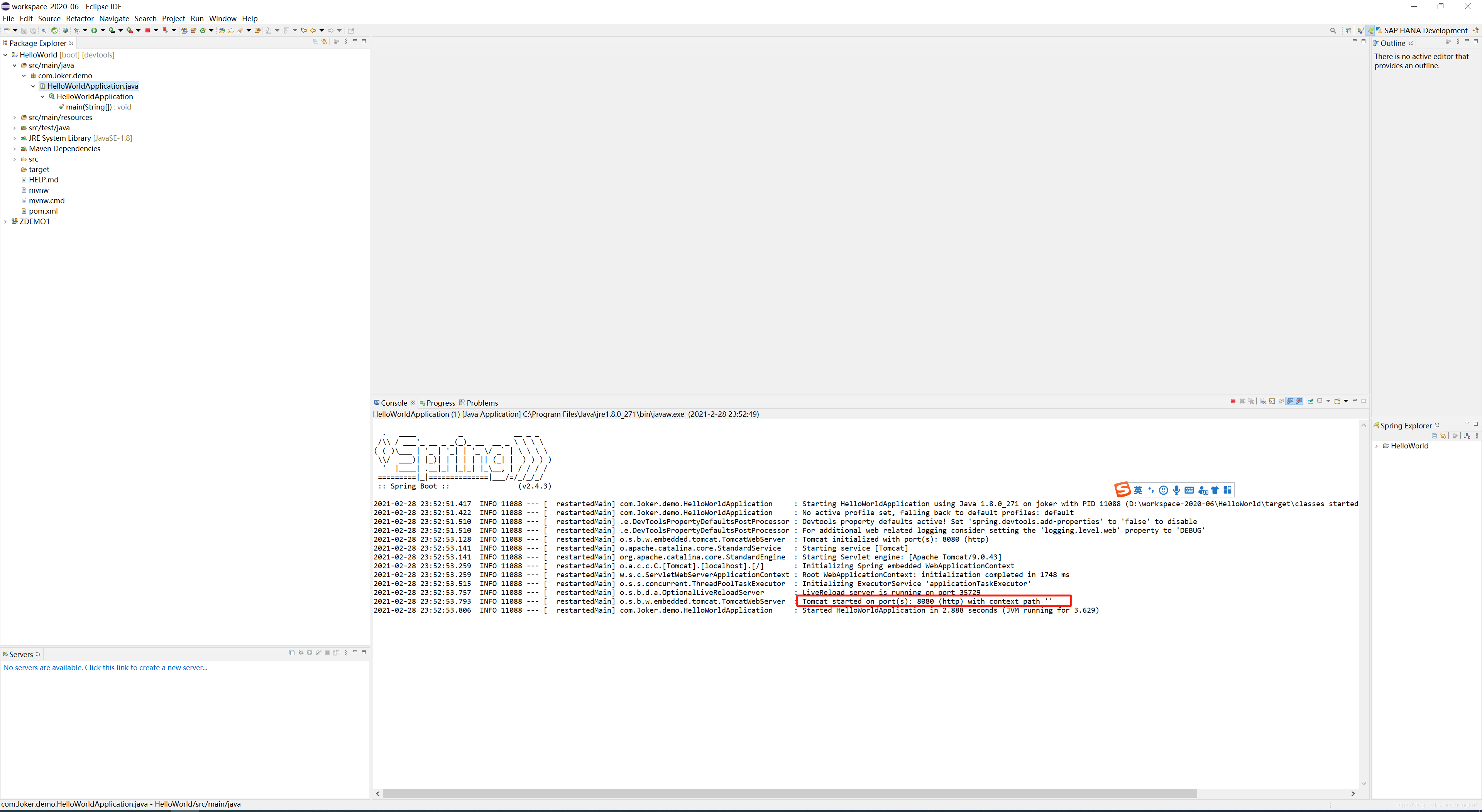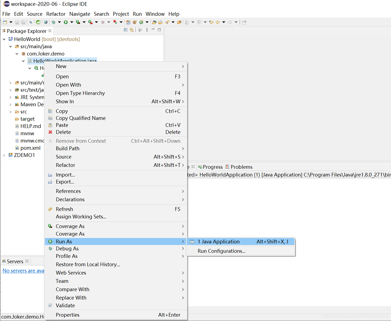 右键HelloWorldApplication->Run as ->Java Application
