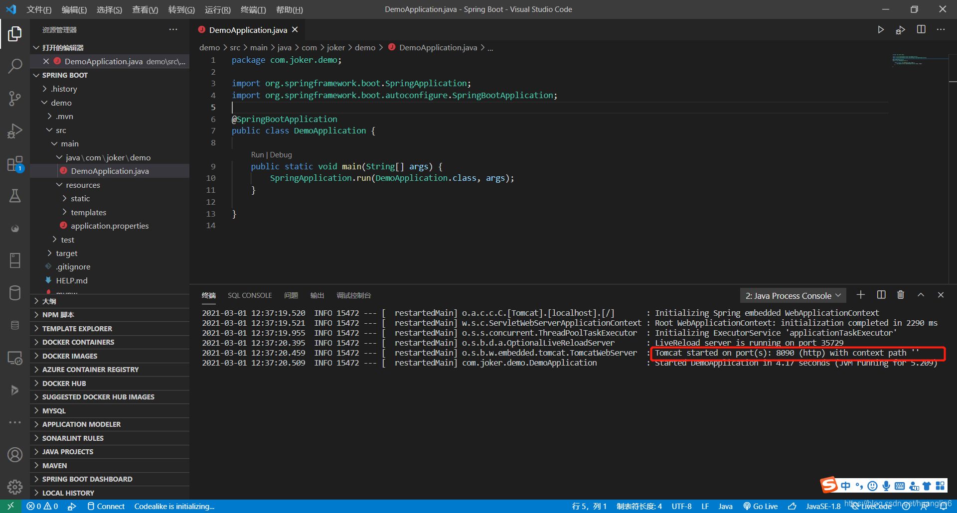 和eclipse一样,点击run或者右上角的运行按钮就会出现下图的界面,可以发现程序已经在tomcat的8090端口启动了