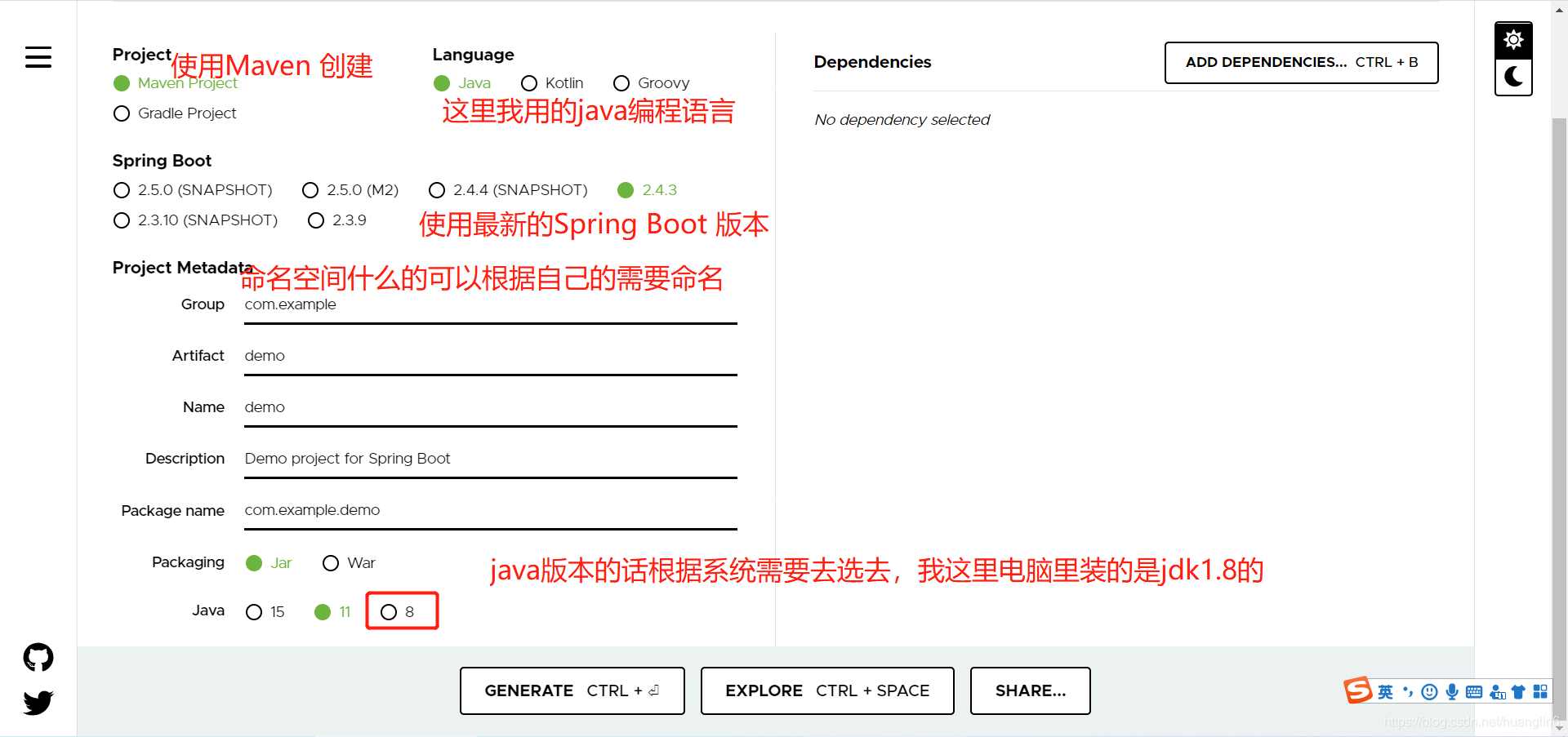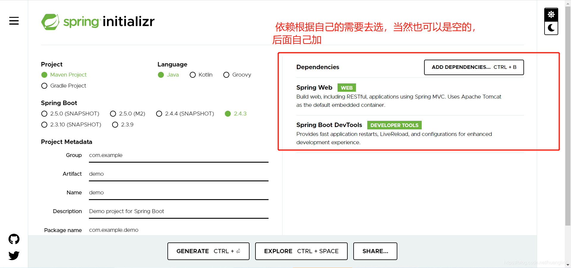 然后点GENERATE 或者EXPLORE,就会导出一个ZIP文本,到时候把这个ZIP文件解压后到eclipse或者vs code 里就可以直接运行了