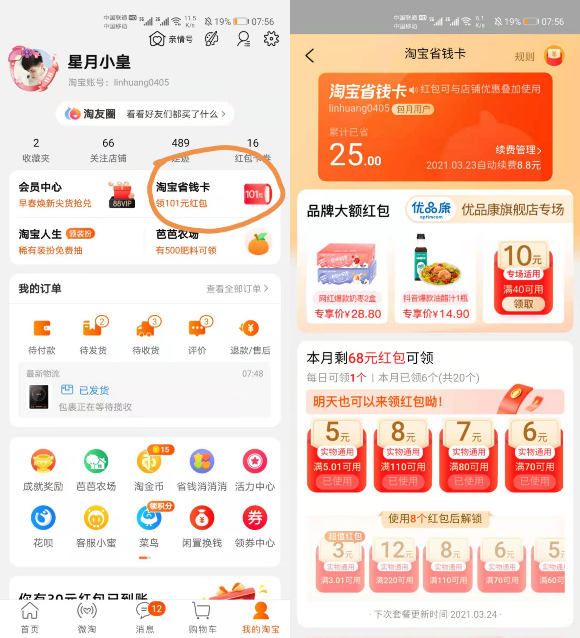 因为我这边公寓是直接拎包入住的,几乎不需要买什么东西,但是锅碗瓢盆什么如果你不想点外卖想自己做饭的话还是需要买的。一些大件的电子设备(比如大屏的显示器、风扇什么的)可以在闲鱼上掏,闲鱼性价比是真的高,然后一些小件,如过锅碗瓢盆、柴米油盐酱醋茶等等可以在淘宝上,这里可以开一个淘宝省钱卡9.9元,然后每天可以领一张满减劵(几块到十几块不止),大概能领20张,一般淘宝现在小件都是包邮的,就每天买一件。算上活动满减+88vip+满减劵,还是能稍微省一点钱的。