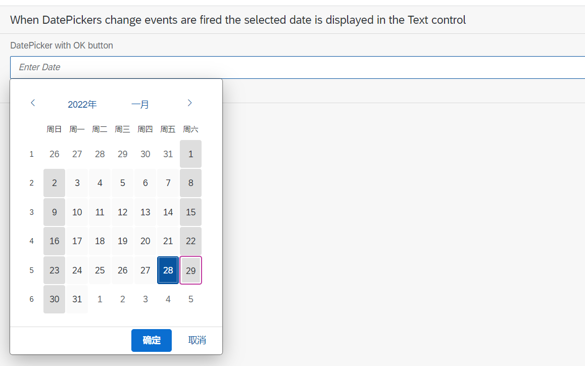 <Label text="Normal DatePicker" /> <DatePicker placeholder="Enter Date" change="handleChange" class="sapUiSmallMarginBottom"/>