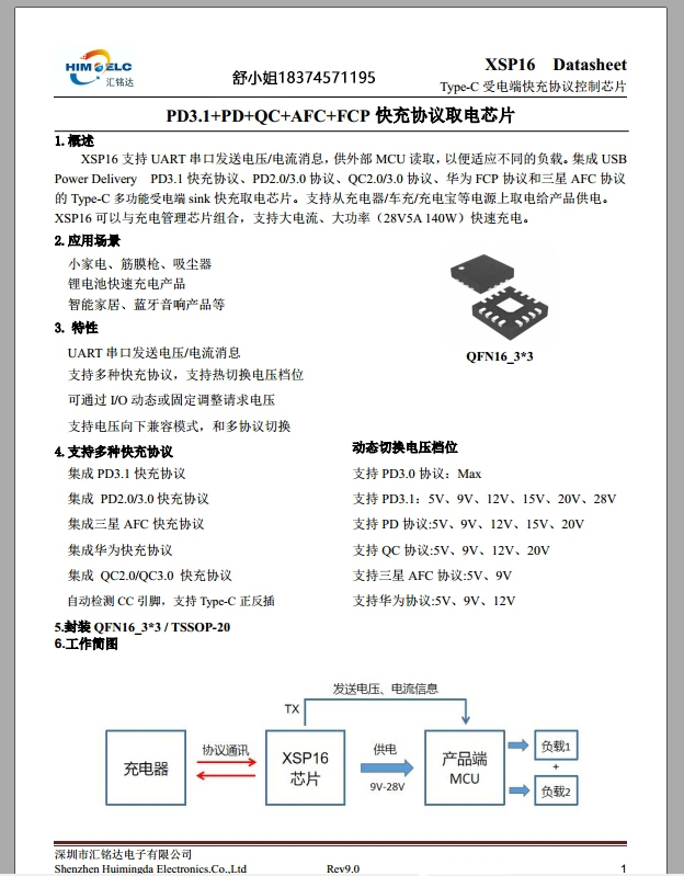 设备插入充电器后,XSP16芯片首先检测充电器支持的协议(如PD、QC、SCP等),并通过握手交换信息(如电压档位、最大电流等)。
